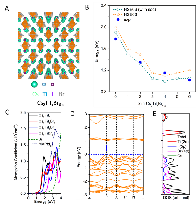 圖四,通過對于Cs2TiI6-xBrx電子結(jié)構(gòu)和帶隙的計算驗證了上述吸收光譜。